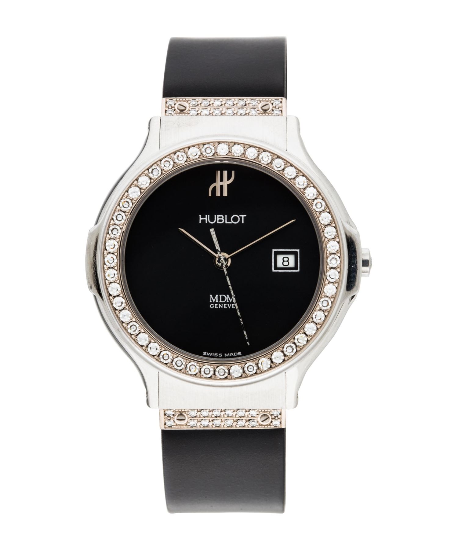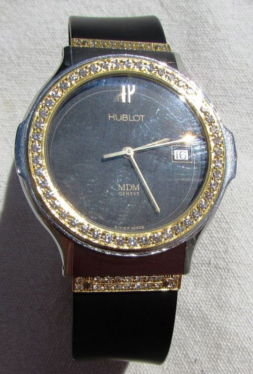 A dress watch with sophistication and style that features a blue dial with diamond hour markers, baton-style hands, and date window. Find great deals on eBay for mdm hublot. This watch features a black rubber band leading to a silver and gold tone circular case housing a black dial with diamond hour indicators, slender gold tone hands, and imprinted with “Hublot MDM Geneve Swiss Made.” CASE Dial Marks:.