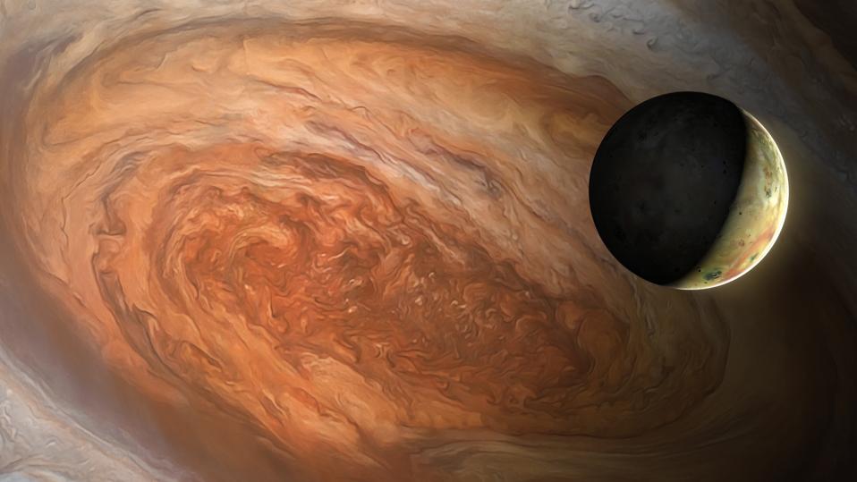 Io is one of Jupiter’s many moons. Moon Io Casts Shadow On Jupiter The Hubble image includes a new storm brewing on Jupiter, and a cousin of the famous Great Red Spot region gearing up to change color. Solar System and Beyond Moon Shadow Over Jupiter Jupiter's volcanically active moon Io casts its shadow on the planet in this dramatic image from NASA's Juno spacecraft.